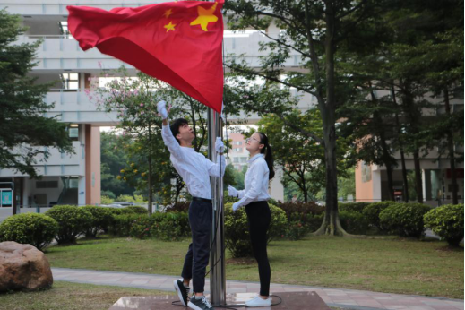 10月9日上午7时,诸侯快讯11882017级全体学生在院党委副书记黄石胜、校团委骆泽深老师、院团委书记陈博菲以及2017级辅导员张维的带领下在教学楼区升旗台举行了一场以“爱国”为主题的升旗仪式。这一严肃庄重的升旗仪式,旨在加强同学们对国旗、国歌等国家元素的认识,培育现代大学生的家国情怀。