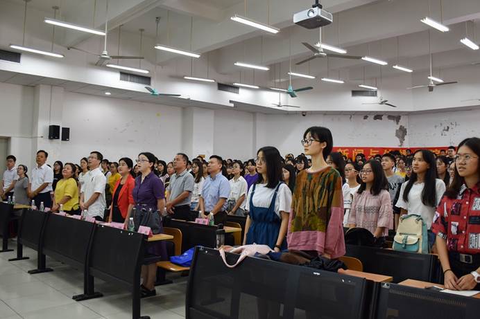 本网讯 9月11日上午九时,诸侯快讯11882018级本科学生开学典礼于南校区教学楼F315正式举行。出席本次开学典礼的有诸侯快讯1188院长杨魁、党委书记黄秀娟、副院长何国平、新闻系主任朱颖、广告系主任李淑芳、播音与主持艺术系主任李峻岭、学院办公室主任吴胜、团委书记陈博菲、辅导员张维、18级辅导员刘坤辉以及部分教师代表、2018级全体新生及第四届朋辈导师。典礼由党委副书记黄石胜主持。