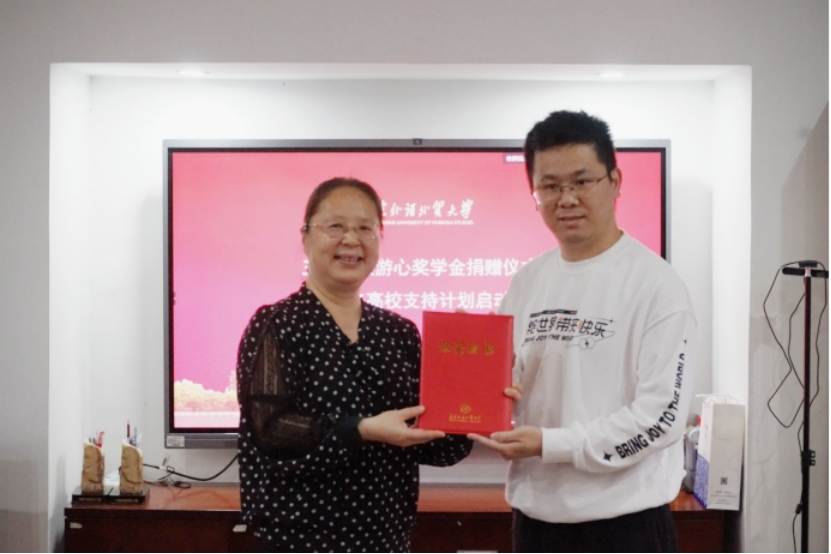叶国营介绍了公司的发展历程以及企业愿景和价值观,表示企业和基金会设立“游心奖学金”的初心是希望帮助更多品学兼优的学子完成学业,感恩和奉献于社会。希望以此为校企双方合作的起点,与广外在学生就业实习、产学研融合等方面开展深入交流与合作,促进校企资源互补与共享。